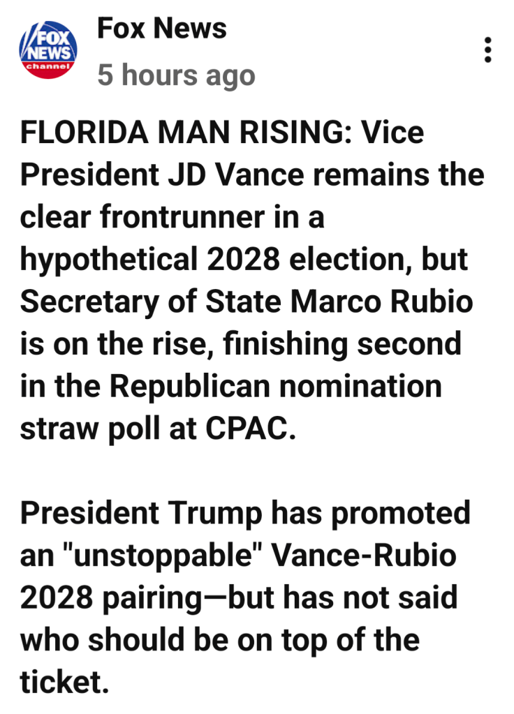 Without (or with) irony, Murdoch refers to spineless contortionist Little Marco Rubio as “Florida man”. Usually the term refers to someone who got a body part removed (or worse) as the result of a drunken provocation of an alligator. In this case we have the two Republican “front-runners” legging it toward the finish line for who will succeed Mr. Trump in 2028, after Trump’s maker calls him for his eternal reward. Got to love the charisma exuded in that photo of soul dead, shape shifting opportunist J.D. Vance.