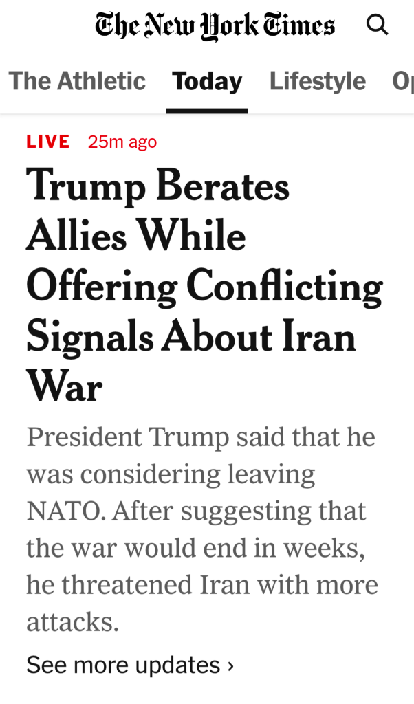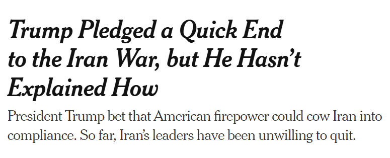 Bold, in its own way. Truth is an undefeatable defense against defamation. Even the most aggressive, vexatiously litigious, criminal ever to be the president has to know this, on some level. Besides, the Commander-in-Chief, now an unprovoked-war time president, has bigger fish to fry at the moment. Got to love the directness of this NY Times headline and lede.