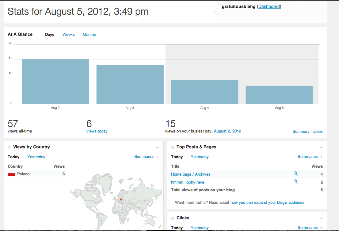 WordPress has a feature that allows you to view constantly updated statistics on how many are viewing, liking, disliking, commenting on, refraining from commenting on, friending and unfriending your blahg. By clicking a tab labelled “stats” you can instantly see a bar graph of views for the previous few days and by looking at the world map on the bottom, find the geographic location of these viewers. Today, for example, as of 2:50 pm, four people in Poland, or one person in Poland four times, had checked the blahg.