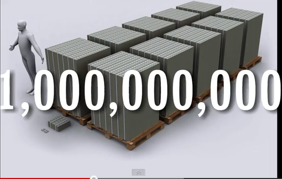 It is hard to conceptualize how much money a billion dollars is. Take a minute to look at this wonderful animation to get an idea, on the way to a trillion, in stacks of hundreds.