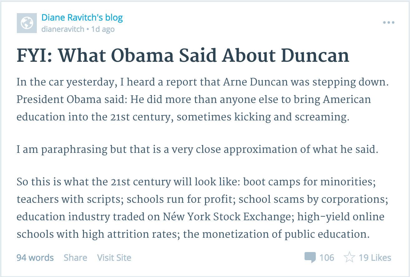 Although I, for one, would not. I think Diane Ravitch is right-on. She is doing much more than repenting her role in Dubya’s revolutionary “No Child Left Behind”. You go, Diane.