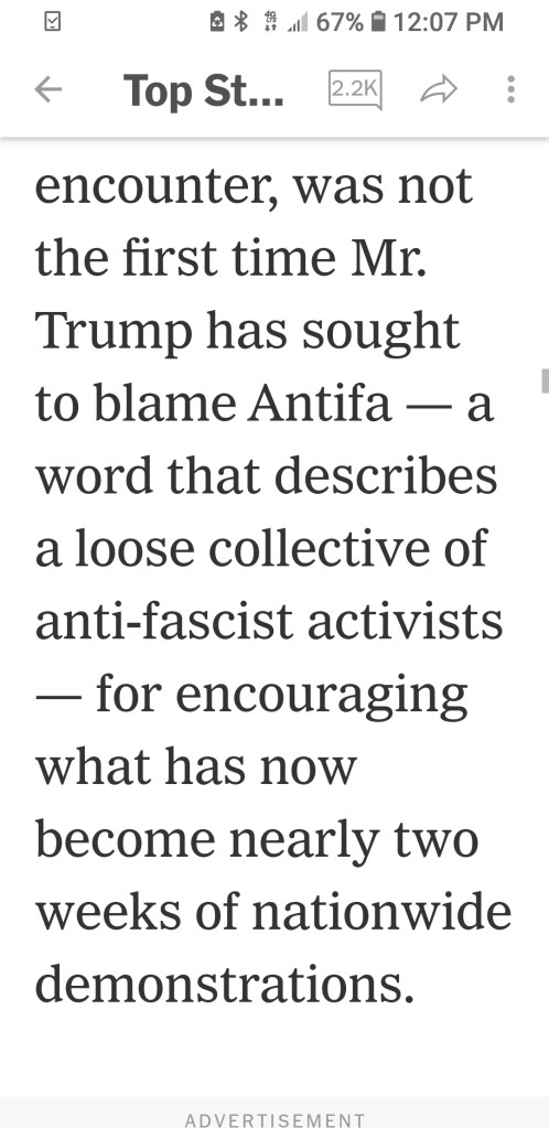 Trump blames the “outside agitator”, “terrorist” group for “encouraging … demonstrations”? Did not both Trump and his Attorney General loudly and repeatedly blame Antifa for the violence and destruction of property, the claimed massive rioting in the streets, that they claim made violent police and military response necessary to save our nation from anarchy? Did Trump ever blame the loose affiliation of anti-fascist groups for “encouraging demonstrations”? Seriously, Grey Lady, don’t you have well-paid professional editors who read this stuff before it becomes “all the news that’s fit to print”?