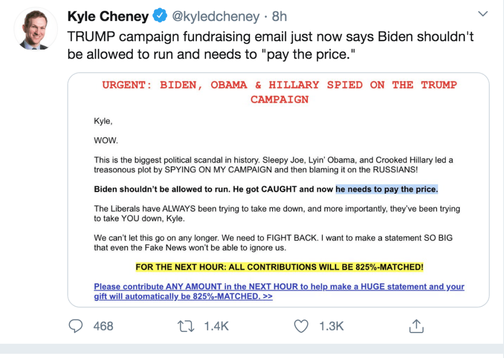 “Unless Bill Barr indicts these people for crimes, the greatest political crime in the history of our country, then we’re going to get little satisfaction unless I win and we’ll just have to go, because I won’t forget it,” Mr. Trump said, referring to the investigation into his 2016 campaign ties with Russia. “But these people should be indicted. This was the greatest political crime in the history of our country, and that includes Obama and it includes Biden.”
