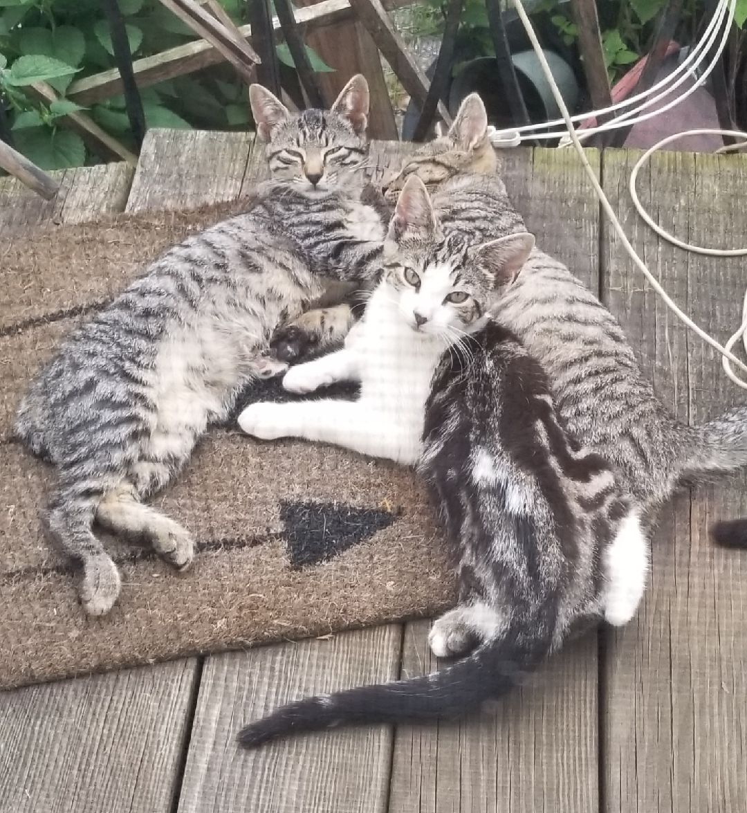 Here is the dominant one, Little Girl (left), with her two brothers, Turtleback and Whitefoot, fine little cats who had very short lives.