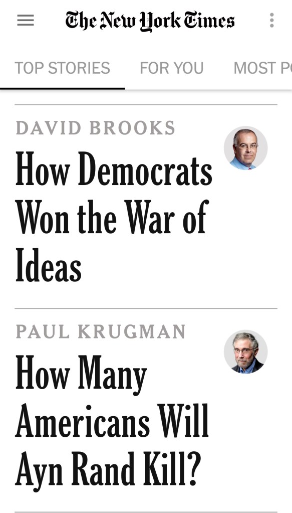 In the real world Ayn Rand’s “philosophy” is Social Darwinism, the perverse notion that it is the absolute natural right of someone with the might to take from the weak whatever they want. Reading Ayn Rand’s gigantic books qualified former Republican House leader Paul Ryan as a Republican intellectual. Her novels were treated by the right as expressions of inviolable universal truth, in the same way religious people venerate their holy books. Put into practice, you get a very ugly society where the weak can go fuck off and die.