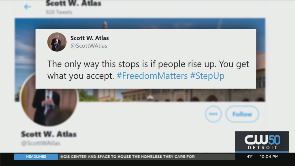 As the president continues to block a rational transition to the Biden administration, at the height of the pandemic, President Trump’s top pandemic advisor, Dr. Charles Atlas, urged the citizens of the great state of Michigan to “rise up”– another incitement to violent overthrow of Democrat Tyranny, in the form of a mask mandate and the closing of businesses to protect residents against a new surge of COVID. (No call to behead the traitorous Republican governors of North Dakota and Utah who imposed similar mandates? Come on, Atlas!)