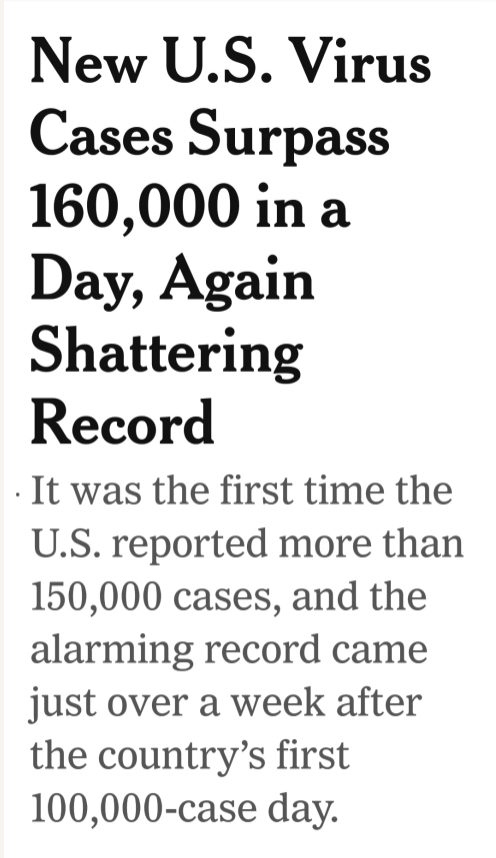 A little more than a week earlier we’d broken the 100,000 case a day barrier (and they said it couldn’t be done!). I attribute this shattered record to all the contact, all over the US, that resulted from the Trump/Kremlin lie that mail-in ballots were tickets to widespread fraud and all the propaganda and Republican voter suppression that sent millions to stand on lines to cast vote in person. In places like Texas, poll workers were not required to wear masks and they could force voters to take off their masks in order to vote. Freedom, you know…