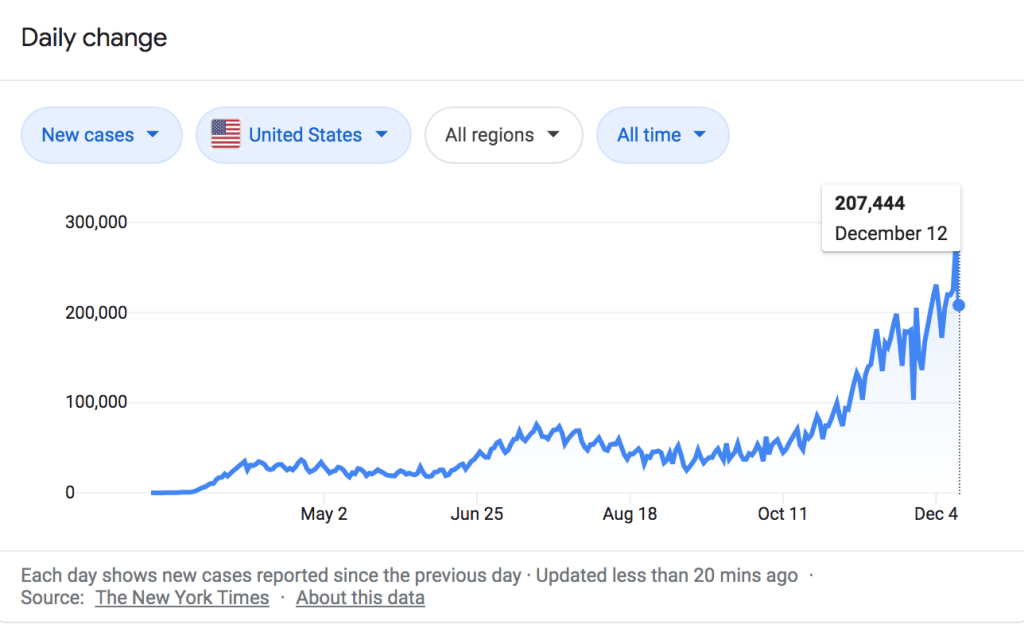 The world’s single nation record for COVID-19 infections in a day was set not long after the presidential election. The NY Times reported: