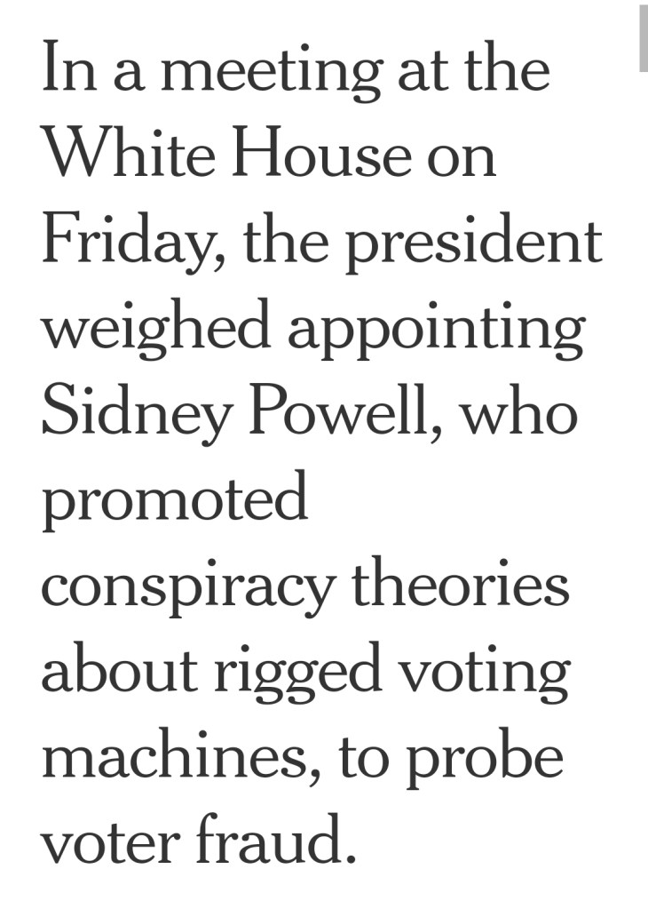 On Friday, we learn, Trump had Mike “Lock Her UP!” Flynn and his insane attorney Sidney Powell at the White House (with demented Trump dead-ender Rudy Giuliani participating by phone) for a powwow on how to keep Trump in power in spite of a pesky election loss of over 7,000,000 votes (and a 74 vote Electoral College margin) and no path remaining through the courts or Congress.