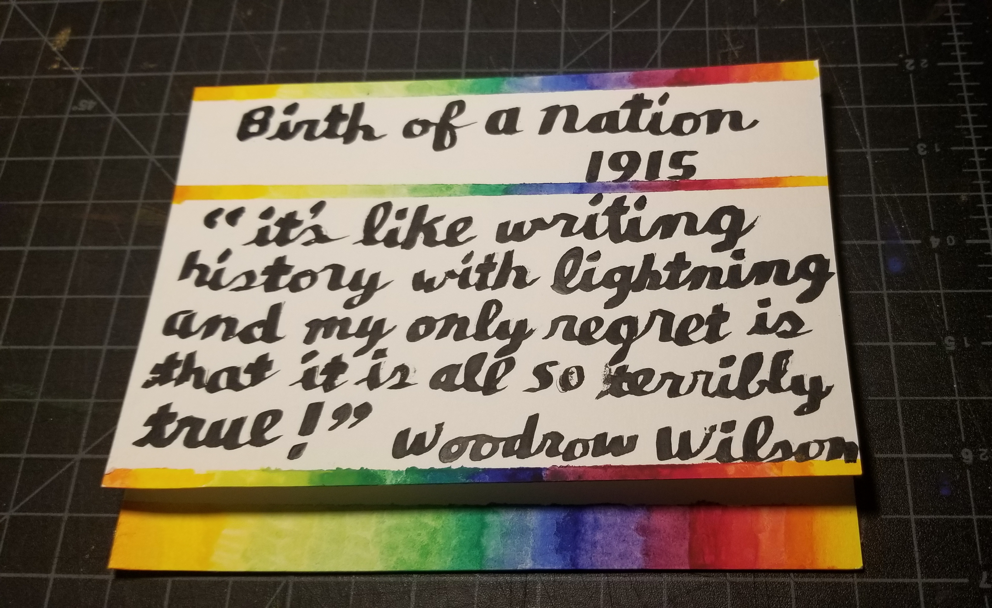 The Birth of A Nation [1] was a breakthrough silent motion picture, the longest ever made at the time — over three hours long, an innovative twelve-reel epic considered by many a kind of masterpiece, certainly a landmark of filmmaking. It was the first motion picture ever shown inside the White House [2], where President Woodrow Wilson, the only American president born in the Confederacy, screened it for his guests. Afterwards he wrote the gushing review above (though probably without the colorful borders).