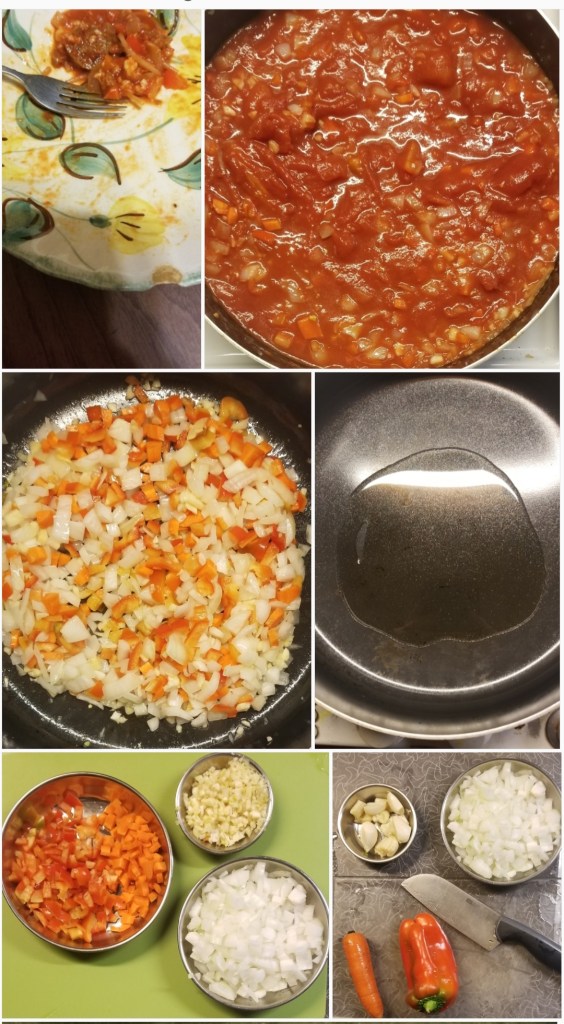 I don’t remember if my mother used red pepper or a carrot (I haven’t watched her make the sauce in more than 45 years), but they add a nice sweetness to the sauce. We like garlic, so I use several large cloves, 1/2 cup, from the looks of this, finely chopped. One medium onion, finely chopped.