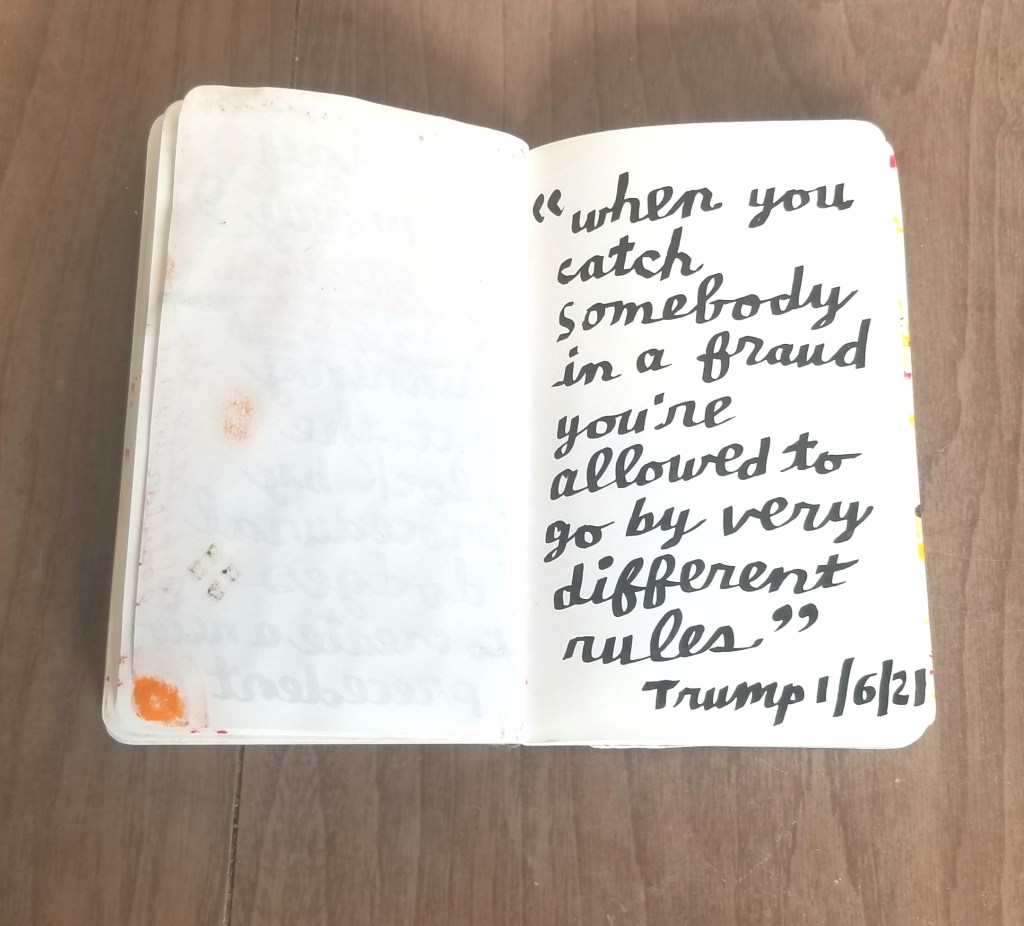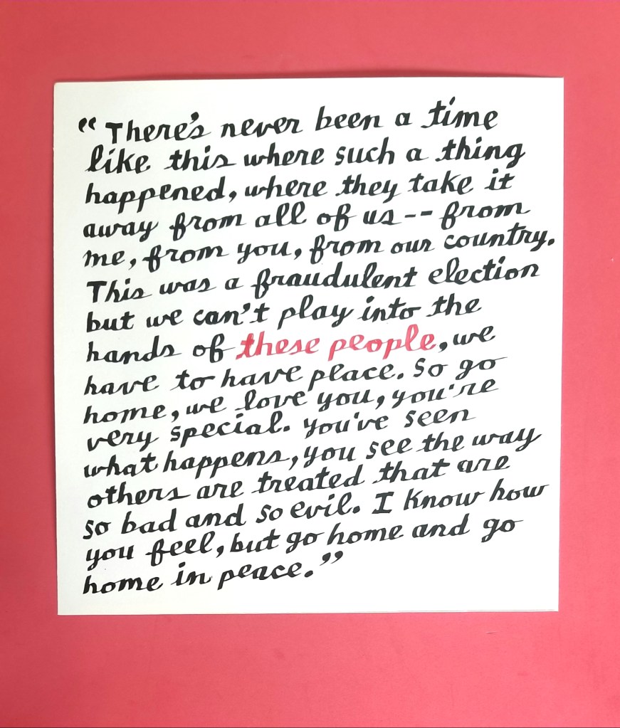 The text of Trump’s tweeted video two hours into the riot (after tweeting his disappointment at Mike Pence’s “lack of courage” [2]). At first, you think “there’s never been a time like this where such a thing happened” (note Yiddish-inflected syntax) refers to the riot at the Capitol he has spent months provoking. A second later you realize he is simply doubling down on his provocative lie, the only thing Trump knows how to do.