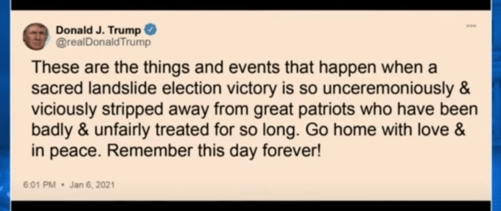 “I know your pain. I know you’re hurt. We had an election that was stolen from us. It was a landslide election and everyone knows it… But you have to go home now,” Trump said in the pre-recorded video that was quickly locked by Twitter “due to a risk of violence.” “We have to have peace. We have to have law and order. We have to respect our great people in law and order. We don’t want anyone hurt. It’s a very tough period of time. There’s never been a time like this where such a thing happened where they take it away from all of us… This was a fraudulent election but we can’t play into the hands of these people. We have to have peace. So go home. We love you. You’re very special.”
