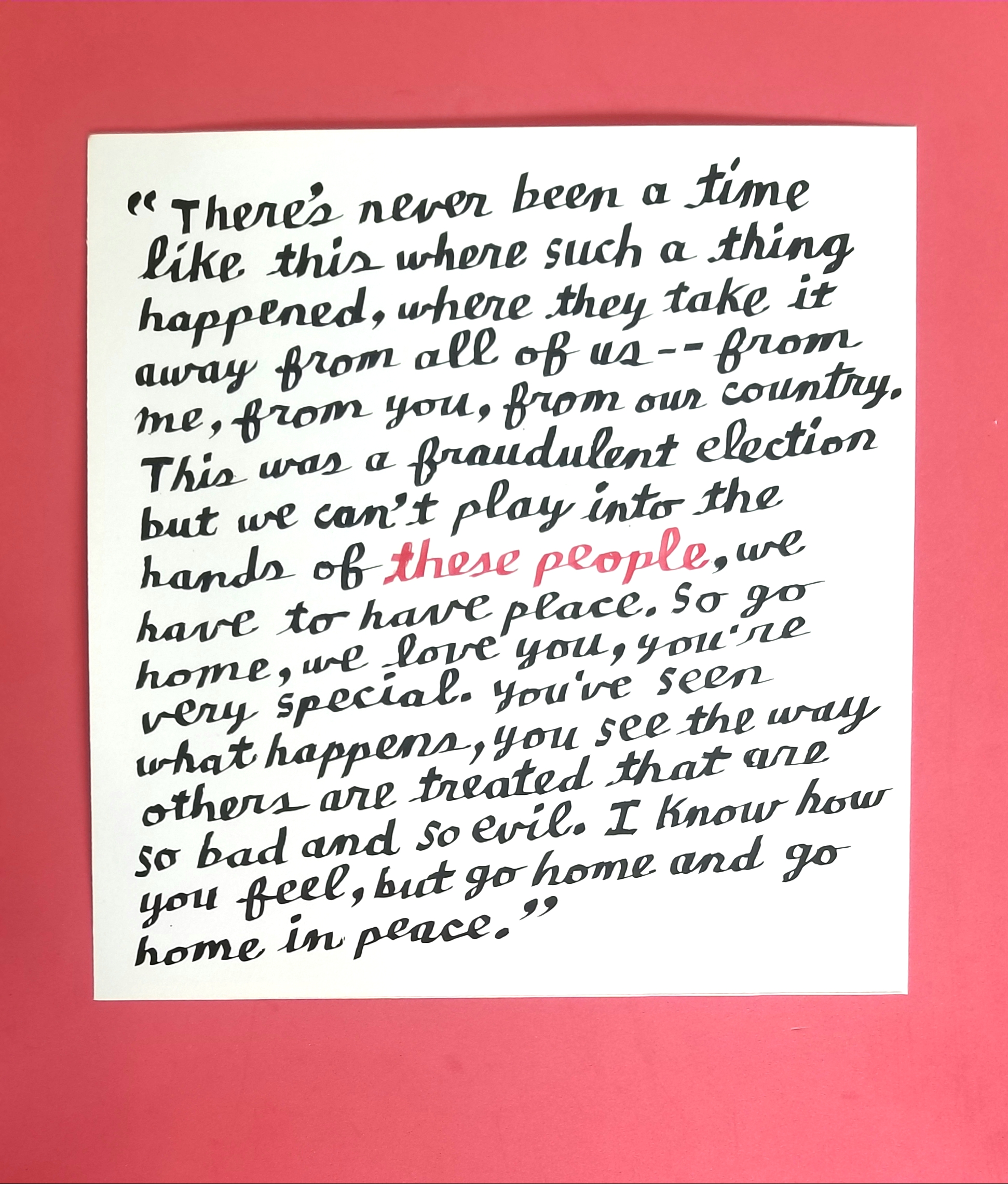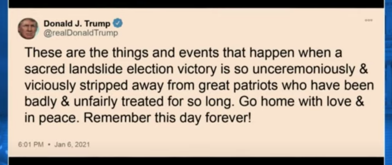 The text of Trump’s tweeted video two hours into the riot (after tweeting his disappointment at Mike Pence’s “lack of courage” [2]). At first, you think “there’s never been a time like this where such a thing happened” (note Yiddish-inflected syntax) refers to the riot at the Capitol he has spent months provoking. A second later you realize he is simply doubling down on his provocative lie, the only thing Trump knows how to do.