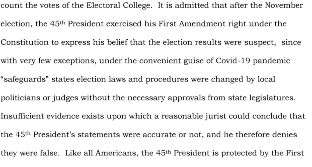 “Insufficient evidence exists upon which a reasonable jurist could conclude that the 45th President’s statements were accurate or not, and he therefore denies they were false.”