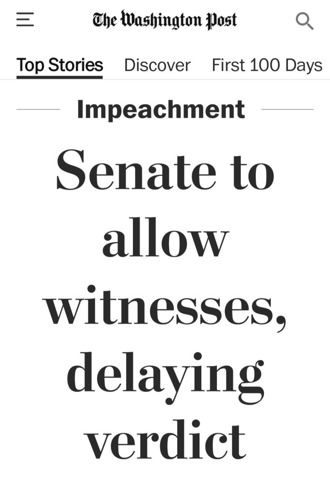 This post is, in part. an example of the power of media reports to enflame passions. I’d been thinking all along that it was a grave mistake for Democrats not to call witnesses. Every expert I admire felt the same way. I woke up late, to the notification of breaking news from Jeff Bezos and immediately had to update the post I began in the wee hours of last night/this morning: