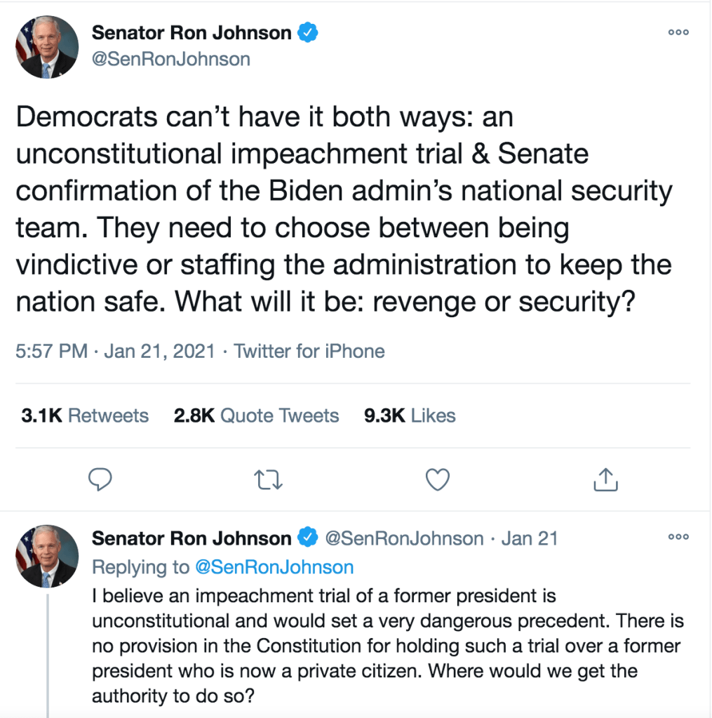 Is Ron Johnson publicly spreading this lie, on some level, because he’s ashamed? Were the GOP 140 Representatives who voted to block the certification of Biden Electors? Hawley? Cruz? Tuberville? The rest of the Senate Voter Integrity Skeptic caucus? Impossible to say, really. That’s what Ethics Investigations are designed to find out.
