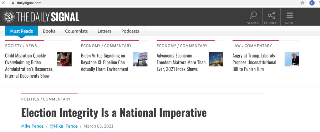 Same as his old job (outside of the danger of being lynched for cowardice), he’s a paid right-wing “scholar” and celebrity talking point mouthpiece at the influential right wing think tank The Heritage Foundation [1]. News broke yesterday, like a foul wind, that Pence authored an opinion piece in his employer’s news letter that is being called an “op ed” — a thoughtful discussion of “election integrity” published by the prestigious on-line journal Daily Signal, a publication of … whoa! The Heritage Foundation [2]. Every headline tells their story: