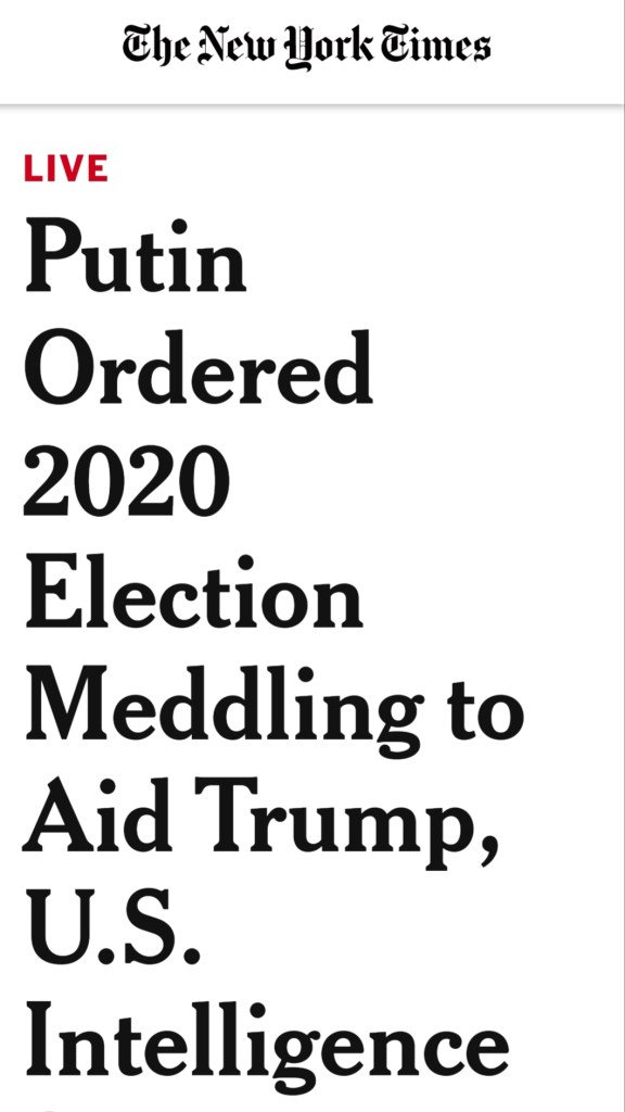 Can anyone really be surprised about this “news” that Putin wanted his guy reelected in 2020? During the 2020 campaign Trump and Barr constantly echoed the incendiary and baseless Putin talking point about mail in voting fraud. Evidence? “It’s common sense,” snorted Barr on national TV, more than once. Draw a straight line from that lie about massive potential fraud by those who voted against Trump, through Trump’s constant carping about a rigged election, to his open attempts to sabotage the US mail system by having his megadonor dismantle hundreds of urban high speed mail sorting machines, remove mailboxes and slow down mail delivery by other shenanigans, through literally hundreds of baseless lawsuits to prevent voting or contest electoral losses, to the well-funded months’ long Stop the Steal publicity blitz, to the riot organized and launched to prevent the certification of the election results, to the screaming about the cancellation of Dr. Seuss and the snarling threats of “scorched earth” in the Senate — and… well, Putin’s laughing, anyway.