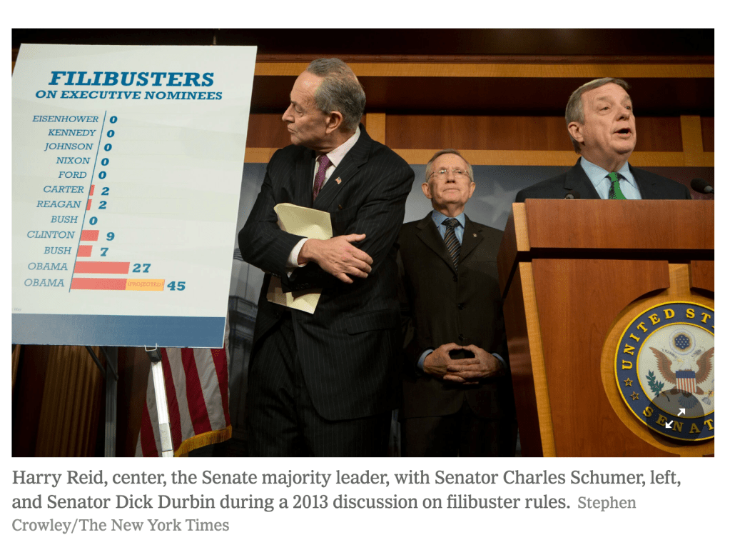 The New York Times ran a very detailed and pretty decent article the other day entitled The Senate’s “Talking Filibuster” Might Rise Again. It contained this telling graph showing how many times the filibuster (raising number of Senate votes needed from 51 to 60) has been used to block Executive Branch appointments. Remember, Trump’s party is the party of the Unitary Executive, viewing the president as a powerful CEO who gets wide discretion in his appointments and blanket protection for every refusal to comply with norms, even laws. Unless, of course, they hate the current president and are determined to use every tactic to make him a failed one-term loser. In that case, all bets are off.