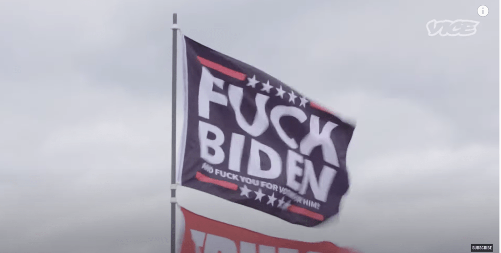 The piece starts with cellphone video of a plane full of enthusiastic Trump supporters en route to D.C. from Tampa. All of the video is from public broadcasts and footage shot by demonstrators and others on the ground before, and during, the January 6 MAGA riot at the Capitol. When I clicked on it on my phone the other night, YouTube gave me this warning.