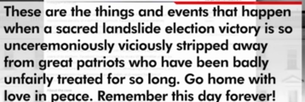 Not only did he post a one minute video on Facebook, thanking his righteous supporters, Trump also tweeted, in one of his final tweets, after federal law enforcement (whose deployment was delayed by three hours) had restored order at the ravaged Capitol, to call off any lingering violent MAGA rioters by tweeting this clear denunciation of the violence: