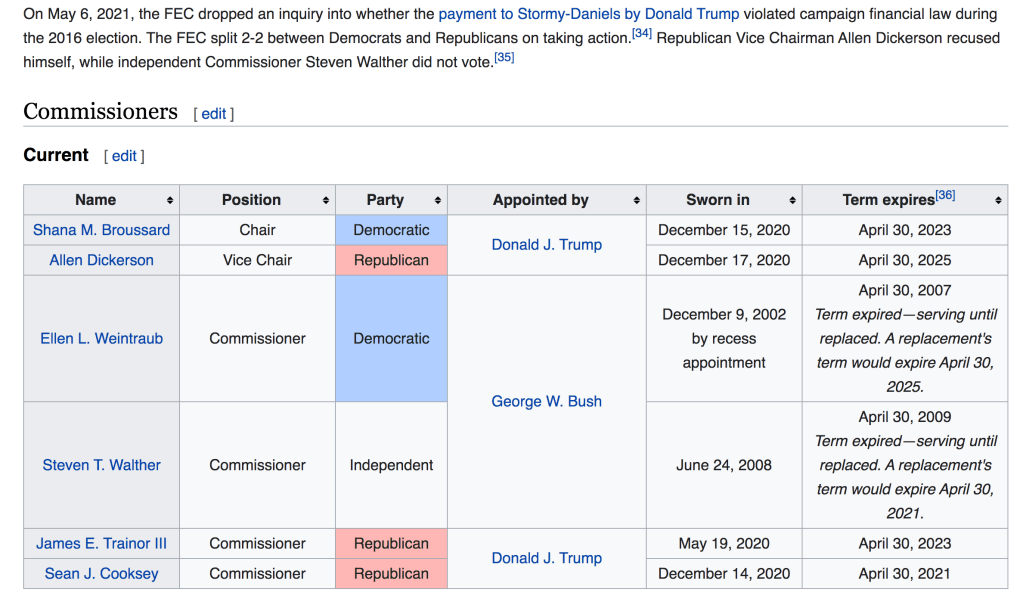Then you recall (with the aid of Wikipedia, less than two seconds away) that until December 2020, after he lost the “rigged, stolen” election, Trump left the FEC without a quorum to vote on ANYTHING. There was no enforcement of anything campaign finance-related by the FEC because Trump left four positions vacant.