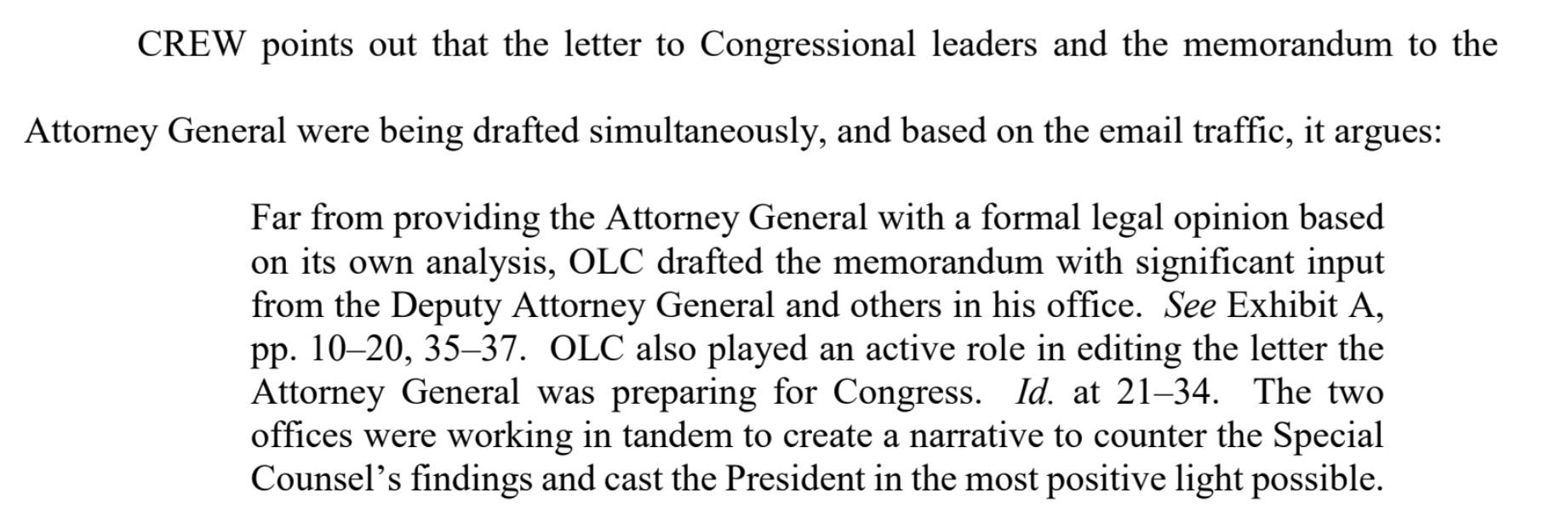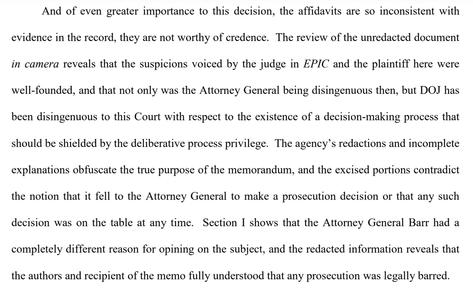 Hopefully the DOJ is also working up a criminal prosecution against Mr. Barr, a gigantic, foul turd in human form. As Judge Amy Berman Jackson pointed out in her decision (at page 27), the plaintiffs (seeking the full memo under the Freedom of Information Act) had pretty much nailed the lying Bill Barr in their pleadings :