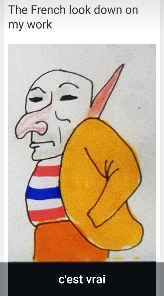 The French look down on my work Sep19 by oinsketta Share this: Share on X (Opens in new window) X Share on Facebook (Opens in new window) Facebook Like Loading... Related