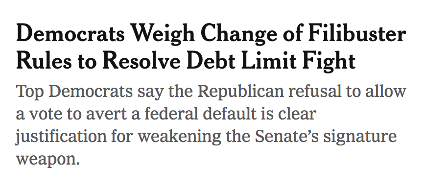 New York Times headline today about the querulous Democrats, faced with a 50-0 GOP threat to filibuster debate and a vote on raising the debt ceiling to pay for some of the $7,800,000,000,000 the GOP added to the national debt in the last four years, to tank the US economy and hurt Biden and his party in the 2022 elections. (Note, this false “deadlock” over extending the government’s ability to pay its past debts is calculated to make the Democrats waste their one shot at reconciliation on keeping the government running, not on the Build Back Better bill).
