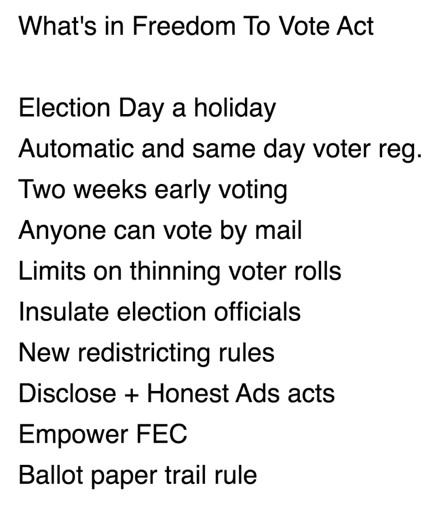 Every Republican from Lisa Murkowski, Mitt Romney, Susan Collins, Roy Blunt, Ben Sasse, John Thune, to Mike Braun, Richard Burr, John Boozman, Shelley Capito, Bill Cassidy, John Cornyn, Tom Cotton, Mike Crapo, Joni Ernst, to Lindsey Graham, Mitch McConnell, Ron Johnson from Wisconsin, Lyin’ Ted Cruz, Fist Raising Josh Hawley and the rest of the Senate Insurrection Caucus had clear and obvious objections to Joe Manchin III’s “bipartisan” compromise bill. Manchin’s rewrite threw a few bones to Republican voter fraud mongers, notably a national voter ID requirement (not an unreasonable thing, if the IDs are easy for everyone to get).