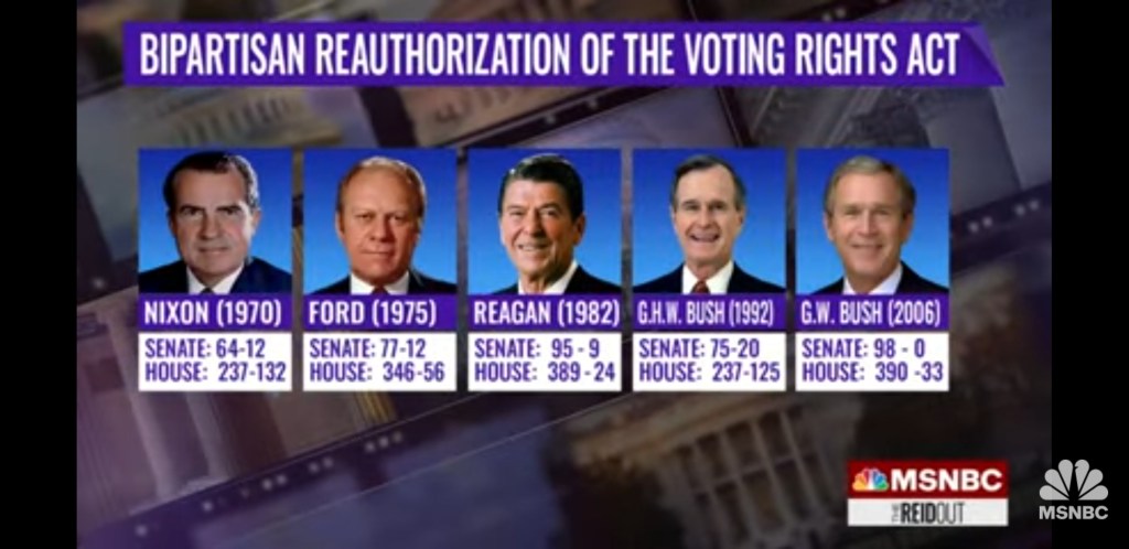The Voting Rights Act of 1965 is arguably the most effective anti-racism, democracy protecting law in our history. It cured much of the abuse it was enacted to fix. It enjoyed broad support under Nixon, Reagan, Bush I and, under Bush II it was reauthorized in the Senate 98-0, just a few years before Dubya’s appointee John Roberts took a sharp gut hook to it, pulled it hard and gave the Voting Rights Act a nice, thorough evisceration [1].