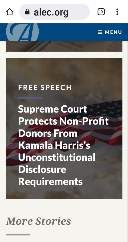Their larger goal is to end all government regulation of business, lower their own taxes, shrink government and enjoy the liberty of a luxurious life without the threat of coercion by a meddling, overeaching government that panders to the “takers”, that undeserving, ever expanding majoritarian tyranny. Their biggest advantage in this fight is an inexhaustible fund of unregulated, untraceable, “dark money”, permitted under the laws that make their political organizations qualify as non-profits. I visited ALEC’s website the other day, and, bingo: