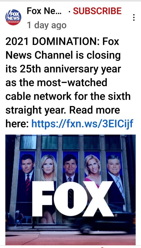 The Fair and Balanced right-wing network that presents engagingly inflammatory opinions and let’s the viewer decide, has taken a bow today on YouTube. They headline their proud announcement 2021 Domination. They certainly have dominated on cable and in the streets (of retirement villages, anyway). Kudos to Rupert Murdoch and his stars, not only did they help put Mr. Trump into office, they helped him steer the US ship of state during his four years as the most powerful man in the world.