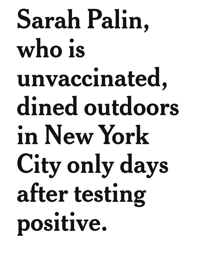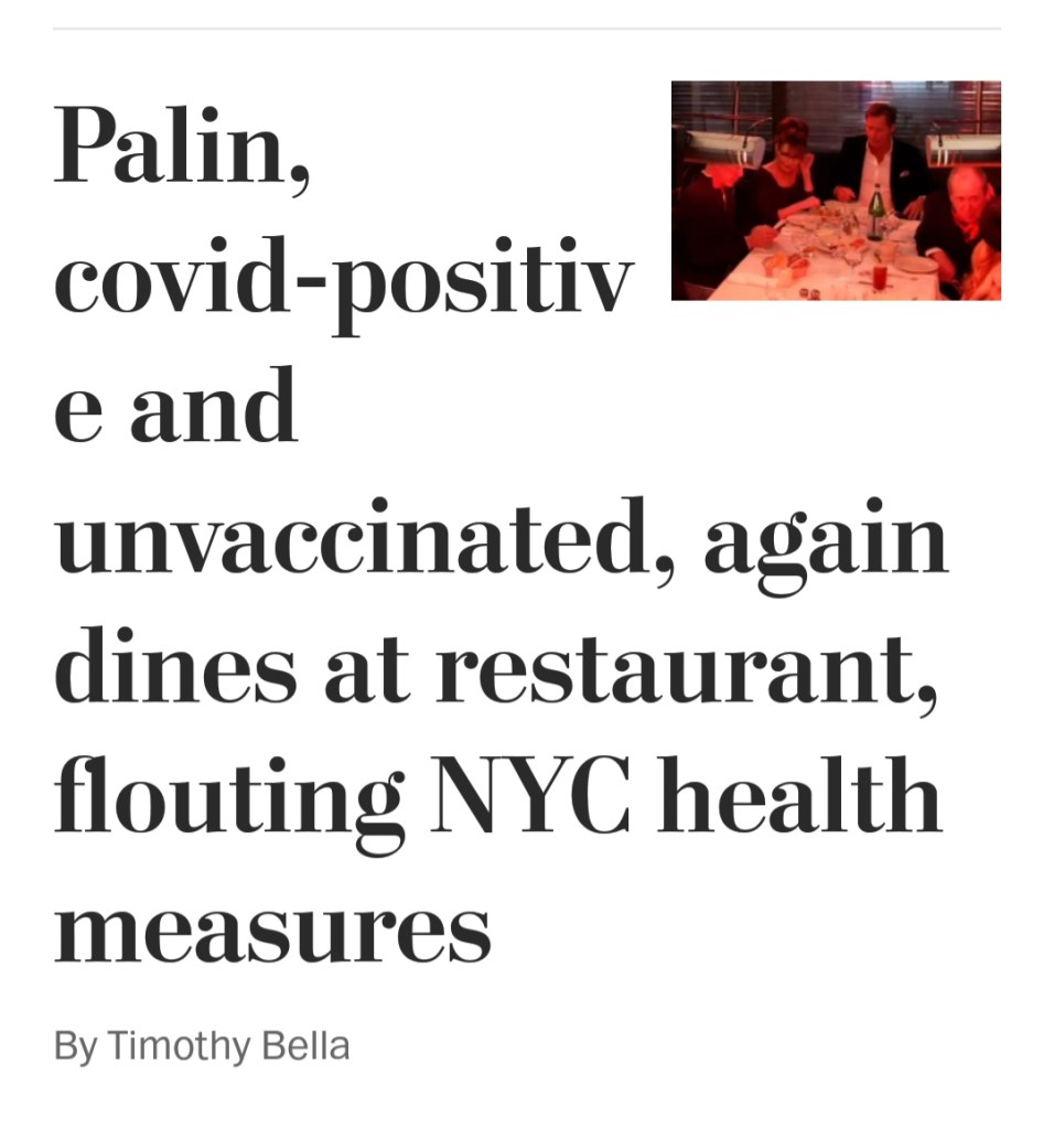 It turns out Sarah Palin ate outdoors, which is apparently fine in New York City if you are unvaccinated, whether tested or untested (covid positive could be a deal breaker there, it is an honor system). The article states that, according to someone, she went back to the restaurant to apologize for the ruckus she’d caused a few days earlier, which may be true. The article also noted that it has not been disclosed when Palin tested positive for covid-19, meaning the five day isolation period the CDC recommends could theoretically have passed. All unlikely, perhaps, but possibly true.