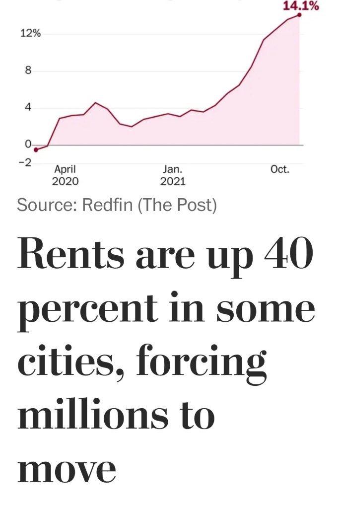 As this recent Washington Post article points out (and the graph above, from the article, shows) average rents across the nation have gone up 14% over the second half of 2021.