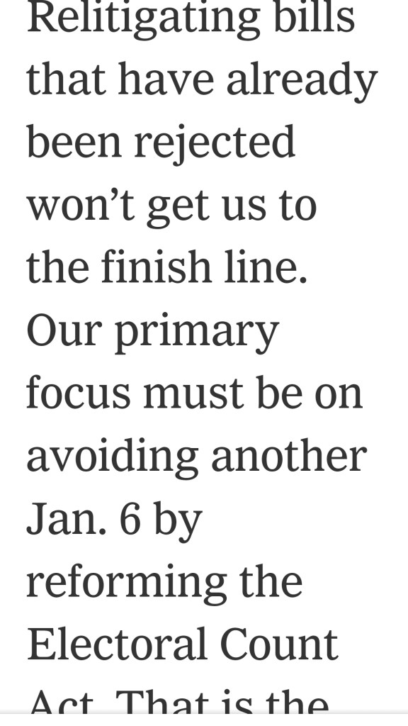 Then we have Susan Collins (R-Maine), the bipartisan defender of Trump (he learned his lesson after the first impeachment), and Boof Kavanaugh (he is actually much more moderate and less intemperate than he seemed when hissing and snarling about a dark money funded far-left partisan plot to ruin his life) penning an op ed for the Times that was a surprisingly well-written case for fixing the broken Electoral Count Act. In tandem with Judge Luttig’s recent op-ed (Luttig was the judge January 6 legal mastermind, and Fifth Amendment-citer John Eastman clerked for) these conservatives make a strong case for fixing the problematic law that Trump tried to drive a convoy of trucks through after losing the 2020 election.