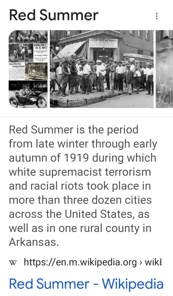 If you are a history teacher in a state that has a right wing legislature and governor (and it has been a concerted project of the right to capture as many Independent State Legislatures as possible, along with the federal courts) your career may be in danger if you ask your students to google Red Summer. You see, having students click on a website that documents dozens of little known racist massacres of a hundred years ago will undoubtedly make innocent, white, Christian kids feel bad. History can be a very mean adolescent girl.