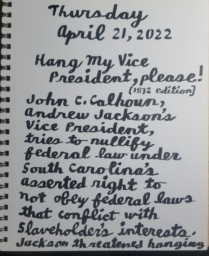 John C. Calhoun, employing an early version of the now new again Independent State Legislature Doctrine, secretly authored South Carolina’s refusal to obey a federal law under a States’ Rights argument. He argued, arguably seditiously, that a state need not follow a federal law that it found repugnant to its traditions or offensive to its own interests, in this case the harm it would do to slaveholders to obey this federal tariff against Great Britain. South Carolina announced, almost thirty years before taking up arms against the US in the “War of Northern Aggression,” that it was officially nullifying this odious federal law in South Carolina. Predictably, Jackson was furious and ready to go down to South Carolina and personally hang John C. Calhoun.