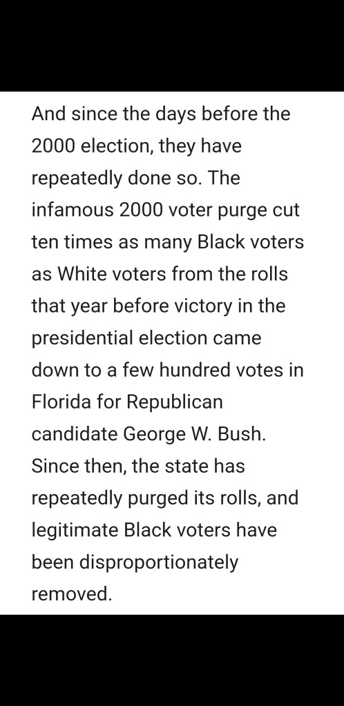 The steps to totalitarian control by a small, determined minority are always the same. First, end “majoritarian tyranny” and the “coercive state” by limiting the right to vote to your supporters. It is helpful to control advertising and media prior to elections by spending billions to make sure your supporters vote the right way. The US Supreme Court, by a one vote majority, has approved both of these techniques, ruling that enforcement of the Voting Rights Act is unconstitutional and that anonymous donors can spend unlimited amounts to influence electoral outcomes. In each state, we have legislatures, so-called independent state legislatures, that march to the same drumbeat of social control. Here’s the Florida version, going back to 2000.