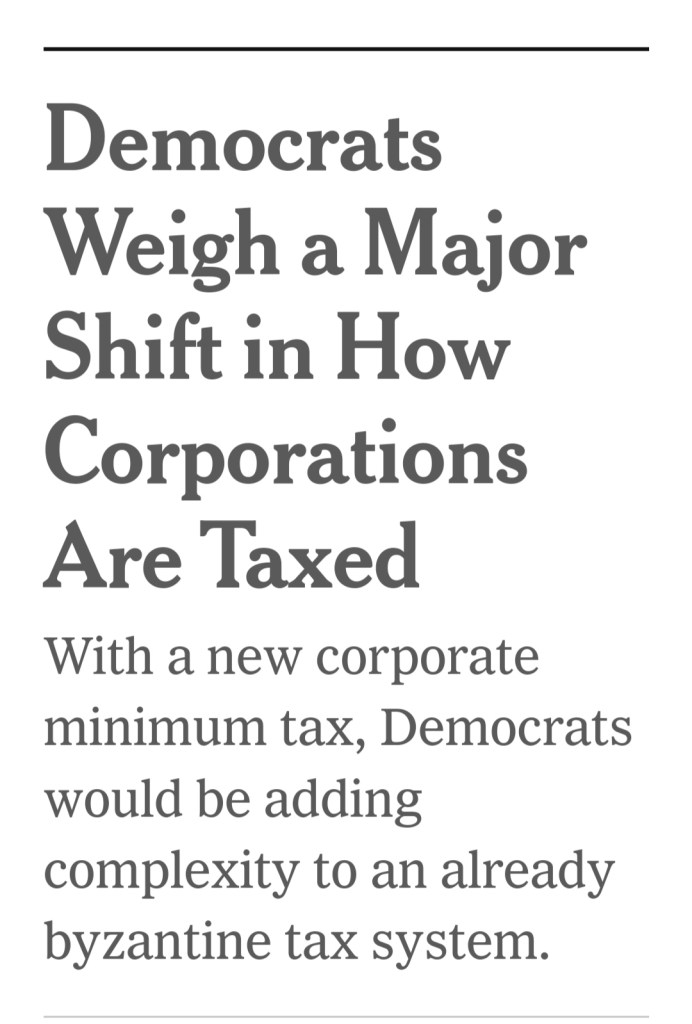 What we learn here, from the vaunted Grey Lady, is that in making it unlawful for billion dollar businesses to not pay 15% in tax (in a nation where many of them currently, legally pay 0%) — well, here’s the inimitable fucking New York Times