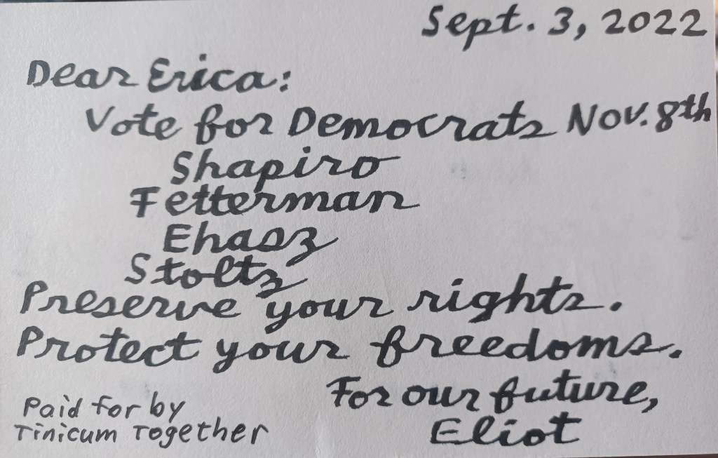 Send them an email at Tinicumtogether@gmail.com and they will send you a packet containing stamped. ready to mail postcards, the names and addresses of swing voters, and, this year, in the crucial case of Pennsylvania, an excellent concise script.