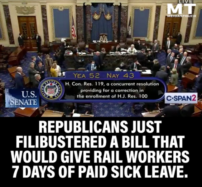 Courtesy of the unapologetic democracy supporters at Meidas Touch. They point out that the 43 Republicans who voted against seven days of annual paid sick leave for railroad workers receive, as part of their Senate perks package, unlimited sick leave. USA!! USA, Baby!!!