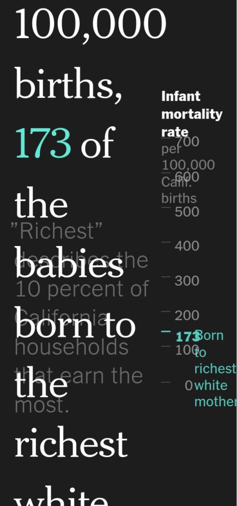 The graphics at the beginning of the online version of the article (link above) show the number of children who die in the first year of life per 100,000 childbirths for wealthy white, poor white, wealthy black, and poor black mothers.