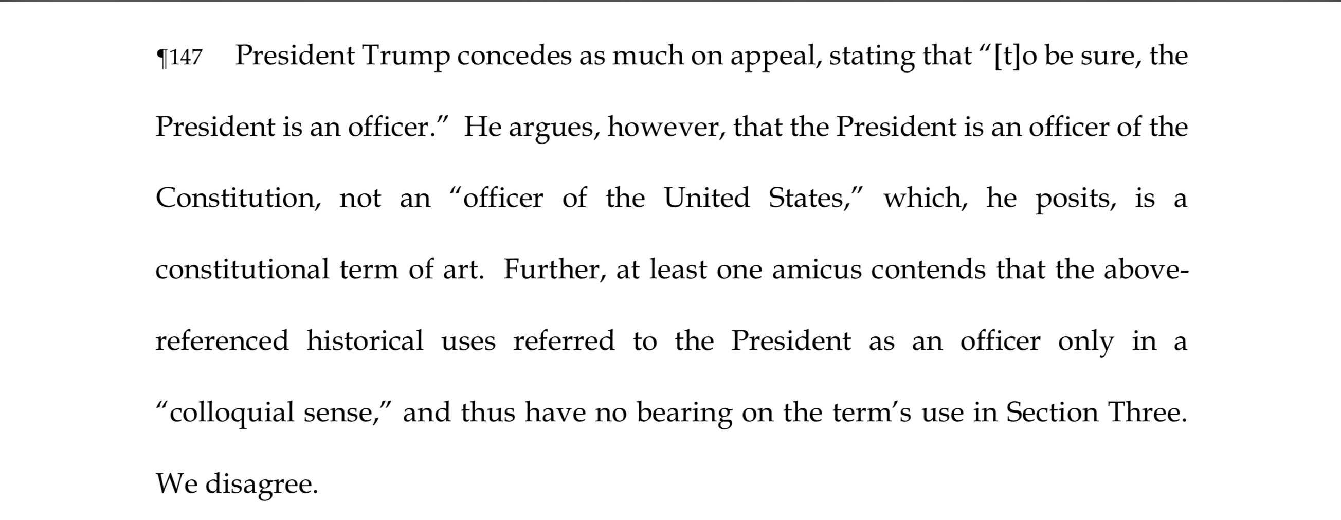From the Colorado appeals court’s decision removing Trump from the Colorado primary ballot after finding him an officer who, at minimum, gave aid and comfort to insurrectionists (“hostages”) violating his oath to protect the country from insurrections against the Constitution. Recall how expeditiously this legally sound ruling was taken up and overturned by the Federalist Society Six, all but one appointed by a Republican president who’d lost the popular vote.