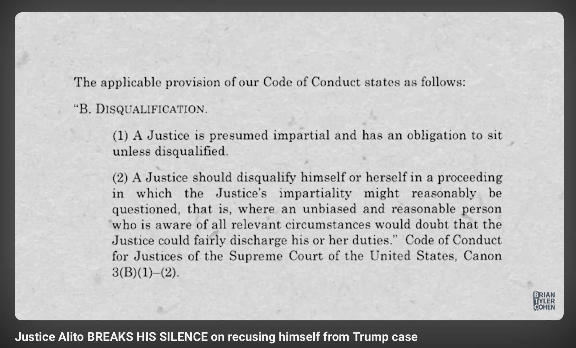 The Nazi sophist replied by letter to Senator Durbin’s spineless attempt to get him to do the right thing. He cited the below as proof that he has no legal obligation to recuse himself from a case he flew flags in support of one of the parties in, and that party’s right to use violence and trickery to overthrow an election he felt he deserved to win. His answer, really, was 6-3 suck it, cuck!