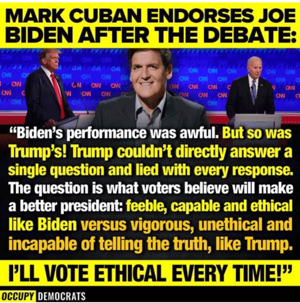 So let me get this straight. A presidential candidate who is a convicted felon gives a debate performance that is often incoherent, consists primarily of obvious lies, and includes a refusal to unconditionally commit to accepting the results of the presidential election, and your editorial is filled with histrionic calls to remove the other guy who’s run the country ably and ethically for almost four years because he had an off night on the stage?