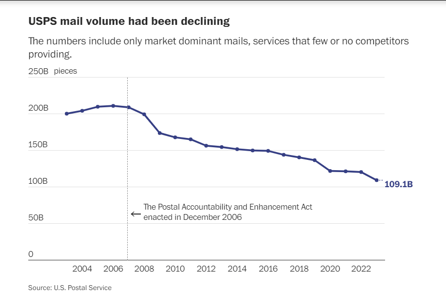 He begins by rightfully blaming the 2006 Republican lame duck law, The Postal Accountability and Enhancement Act (a name as puckish as any of the wry German euphemisms of the late 1930s, arbeit macht frei, anyone?) that put the Post Office $55,000,000,000 in the hole to fund retirements fifty years into the future. The Postmaster, from his July 8th Washington Post op-ed/PR presentation: