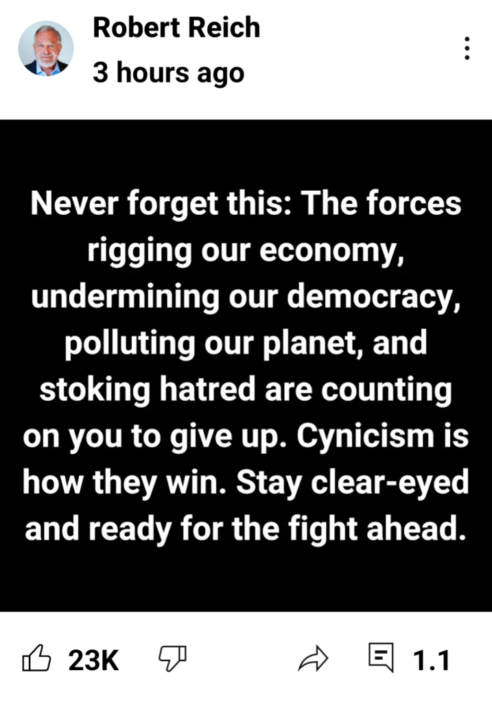 Timely reminder from Robert Reich Nov9 by oinsketta Share this: Click to share on X (Opens in new window) X Click to share on Facebook (Opens in new window) Facebook Like Loading... Related