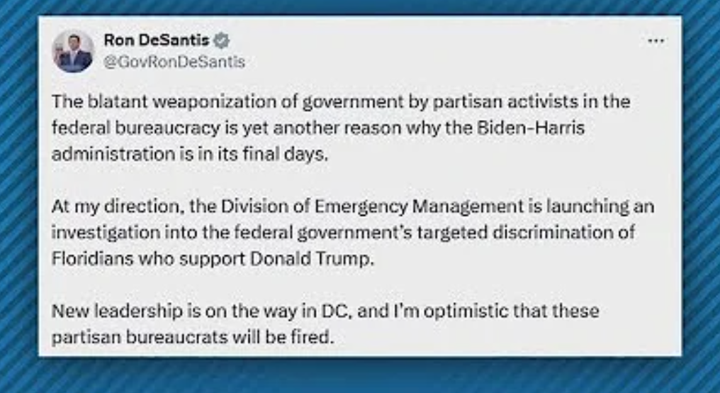 This new “Biden outrage” just in from the folks who brought you “anarchist jurisdictions” who would not receive emergency federal funds during Covid, the last time they held the Executive branch. Of course the bipartisan, willing to cooperate with those who hate him, Biden is the one who, eh, weaponized the government against his enemies… The incoherent but jubilant fascist revenge tour is now officially underway, with lovable Ron DeSanctimonious leading the way, as real leaders do.